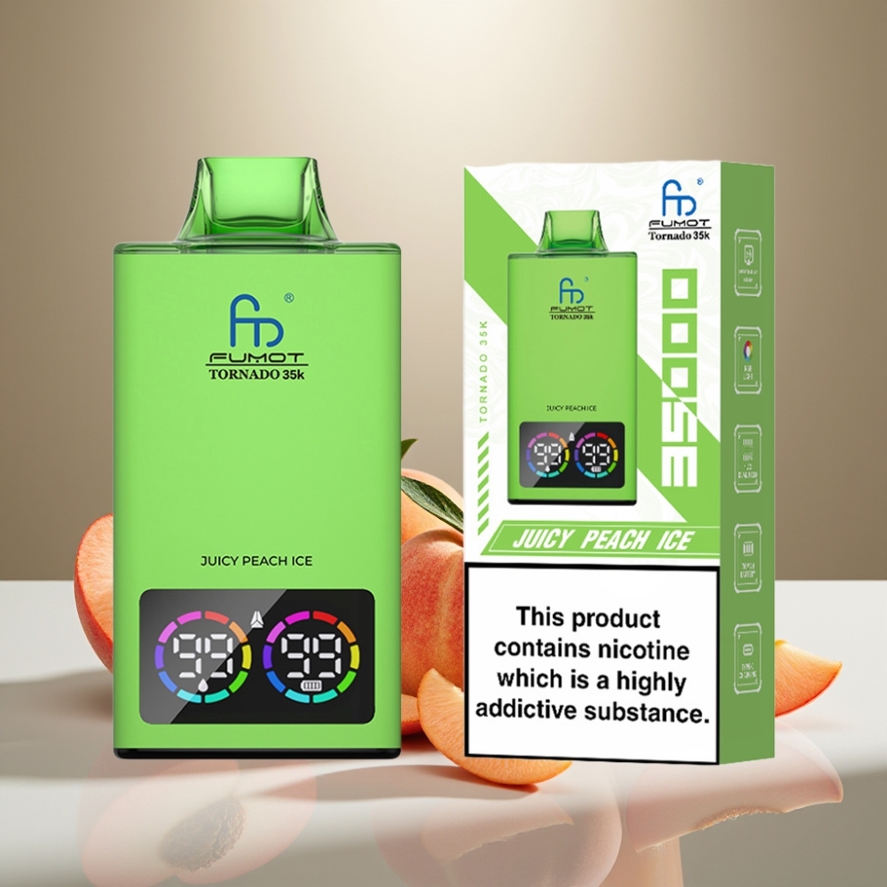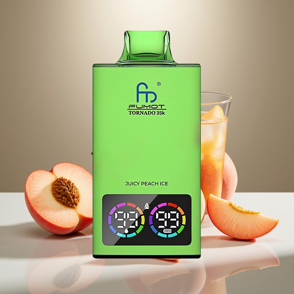 Fumot Tornado 35K Disposable Vape Dzidrs Persiku Ledus, Dual Mesh, 35000 Puffi, 15ml, USB-C